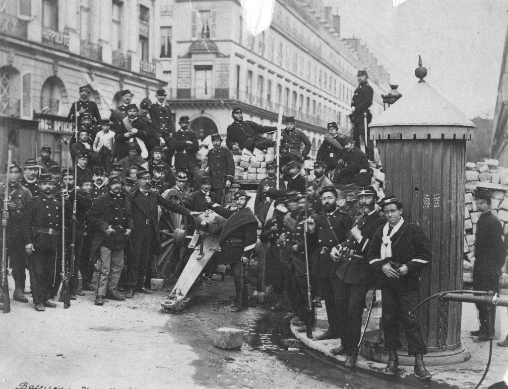 National guardsmen pose in front of an artillery barricade in the Place Vendome, following the Franco-Prussian War.