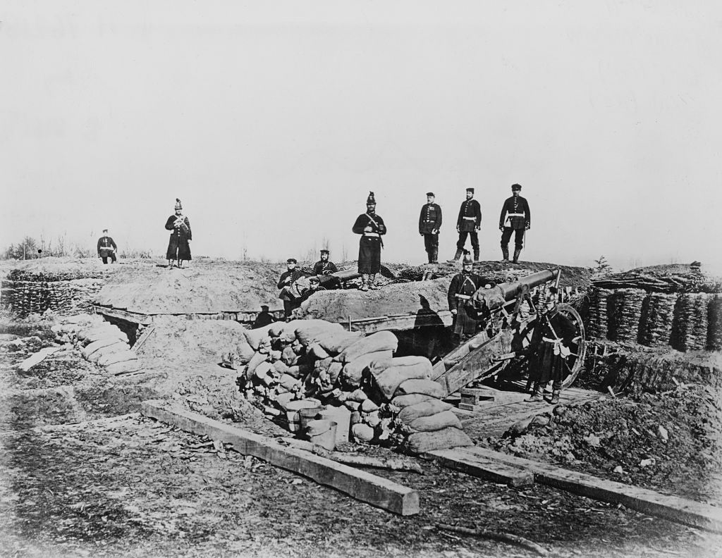 An entrenched Prussian siege artillery battery sighting it’s guns on Paris at the siege of Paris during the Franco-Prussian War on 1 October 1870 at Paris.